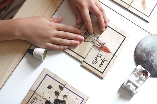 Mega Space pack contains two 4 piece space themed wooden puzzles. This is a square four-piece puzzle of a space theme and the name.