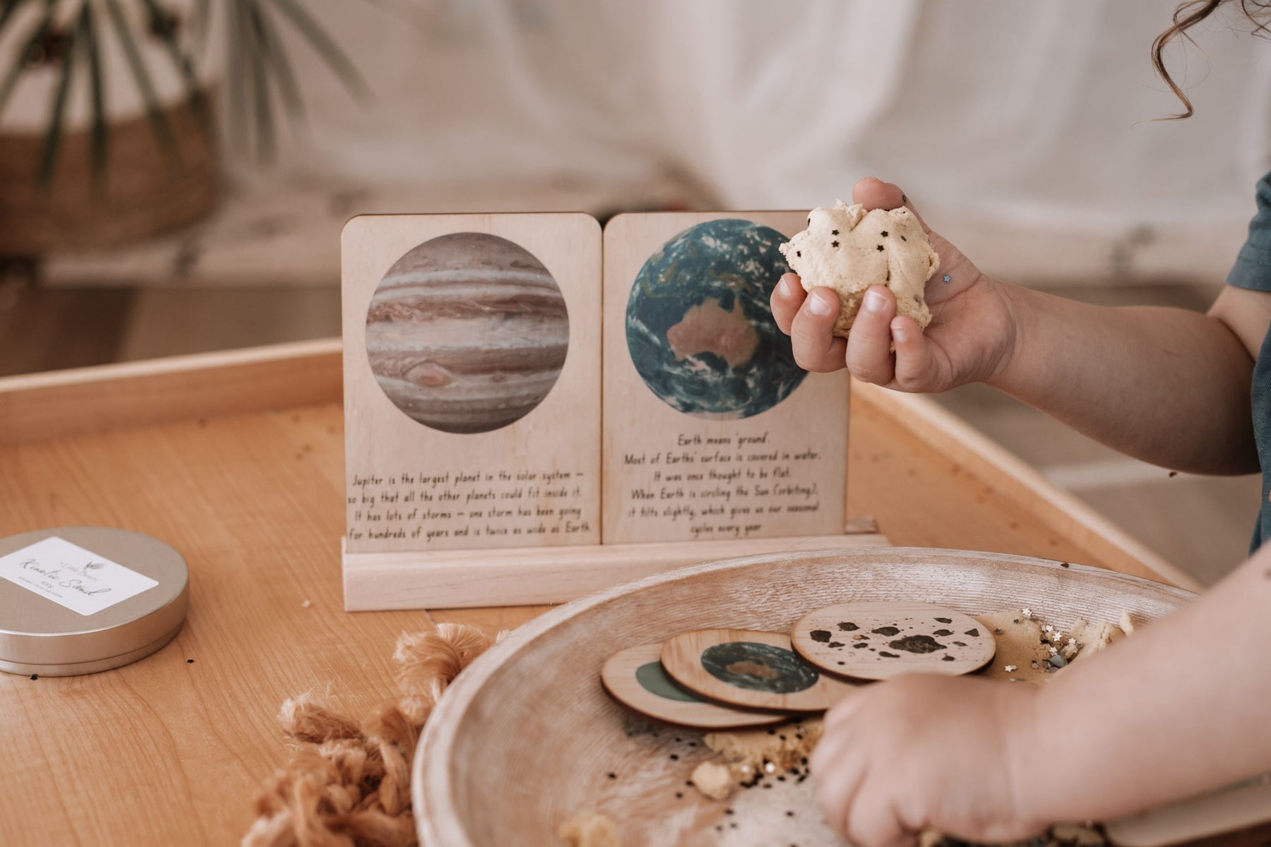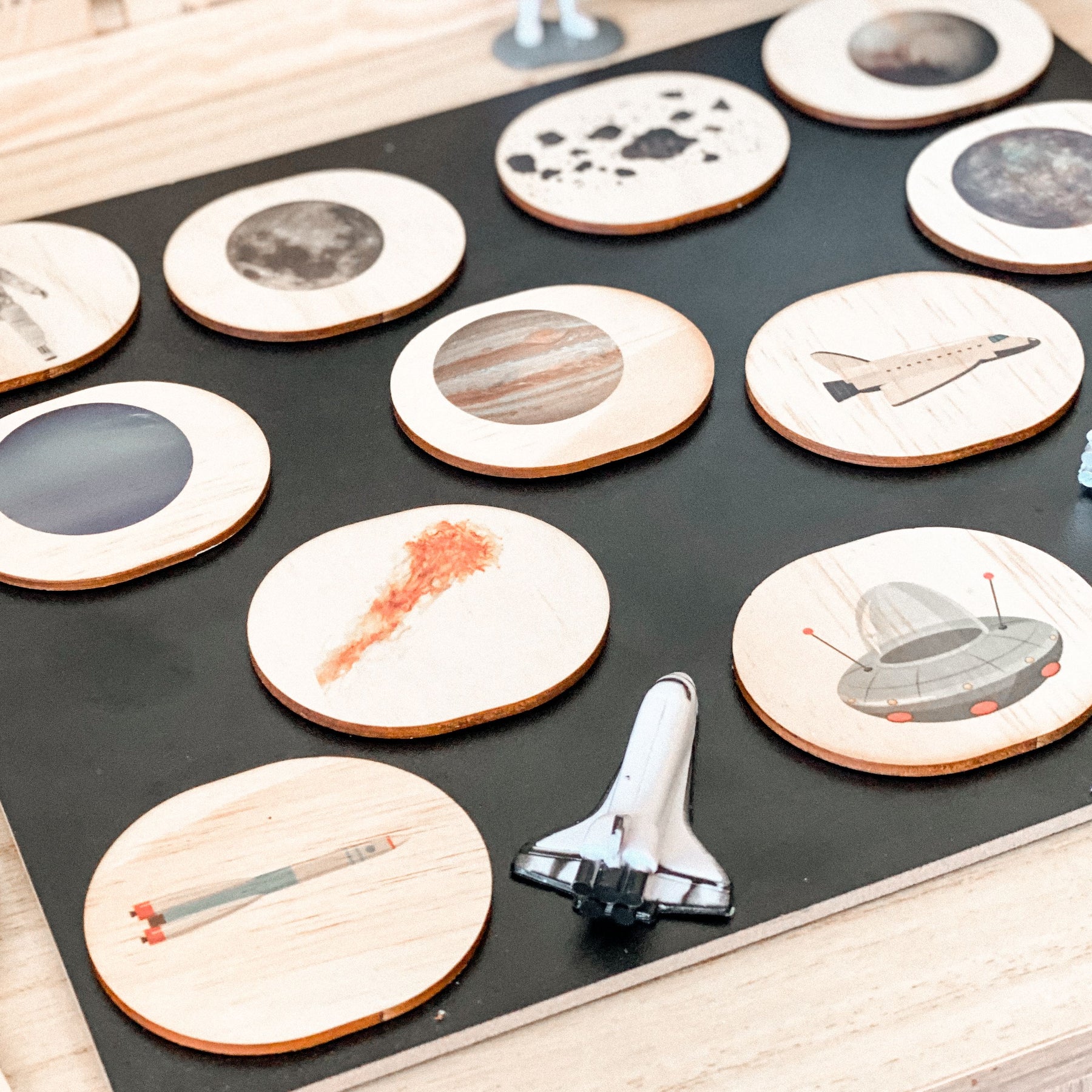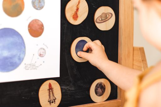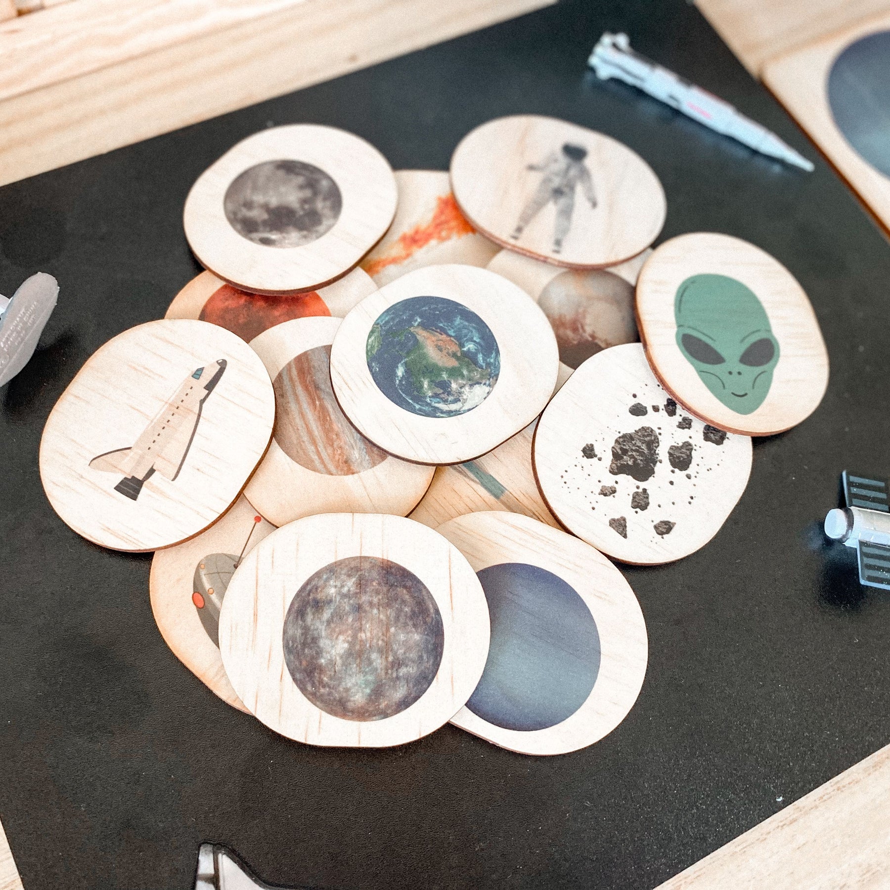 Mega space pack contains six wooden magnets. These colourfully printed discs with realistic images are a versatile learning tool to assist children with discovering and identifying space.