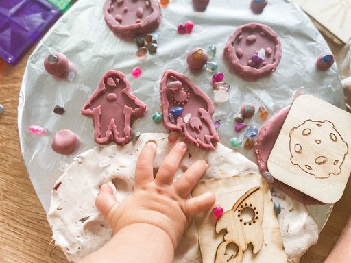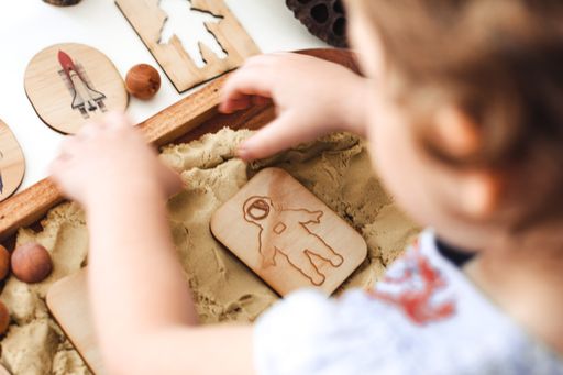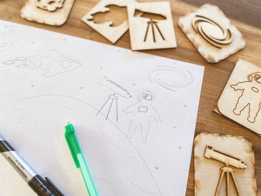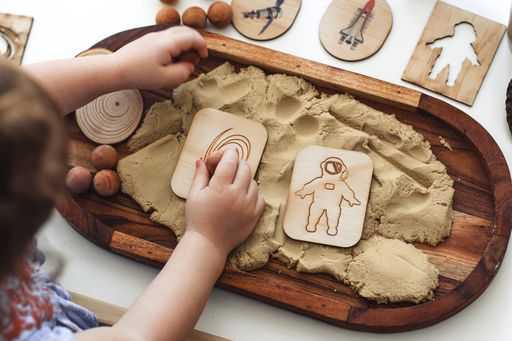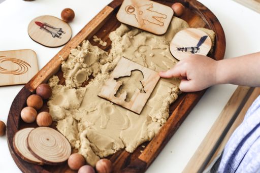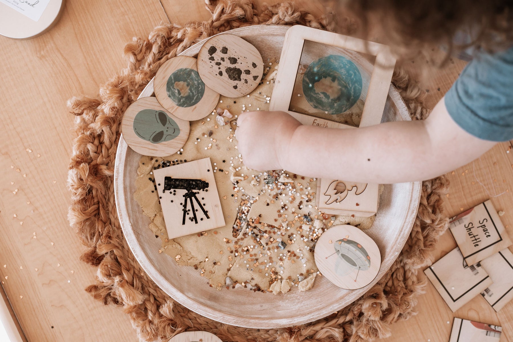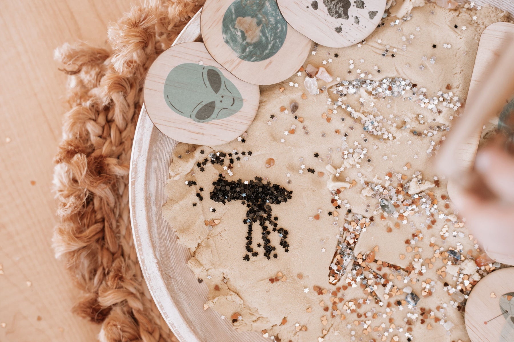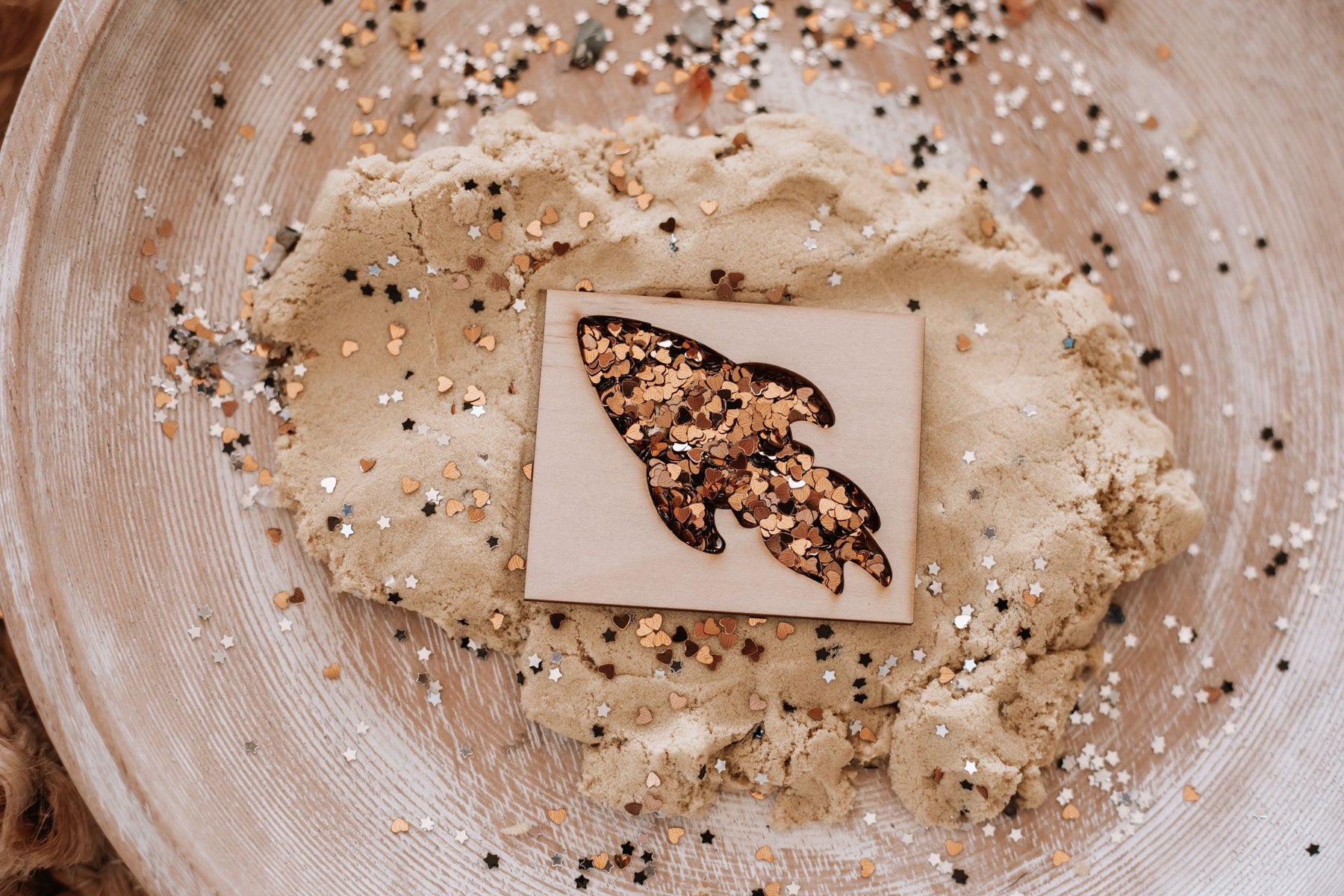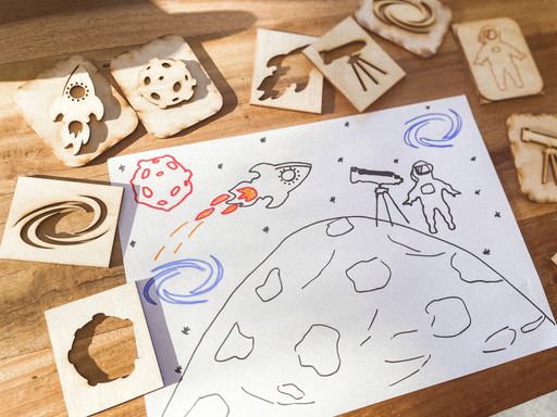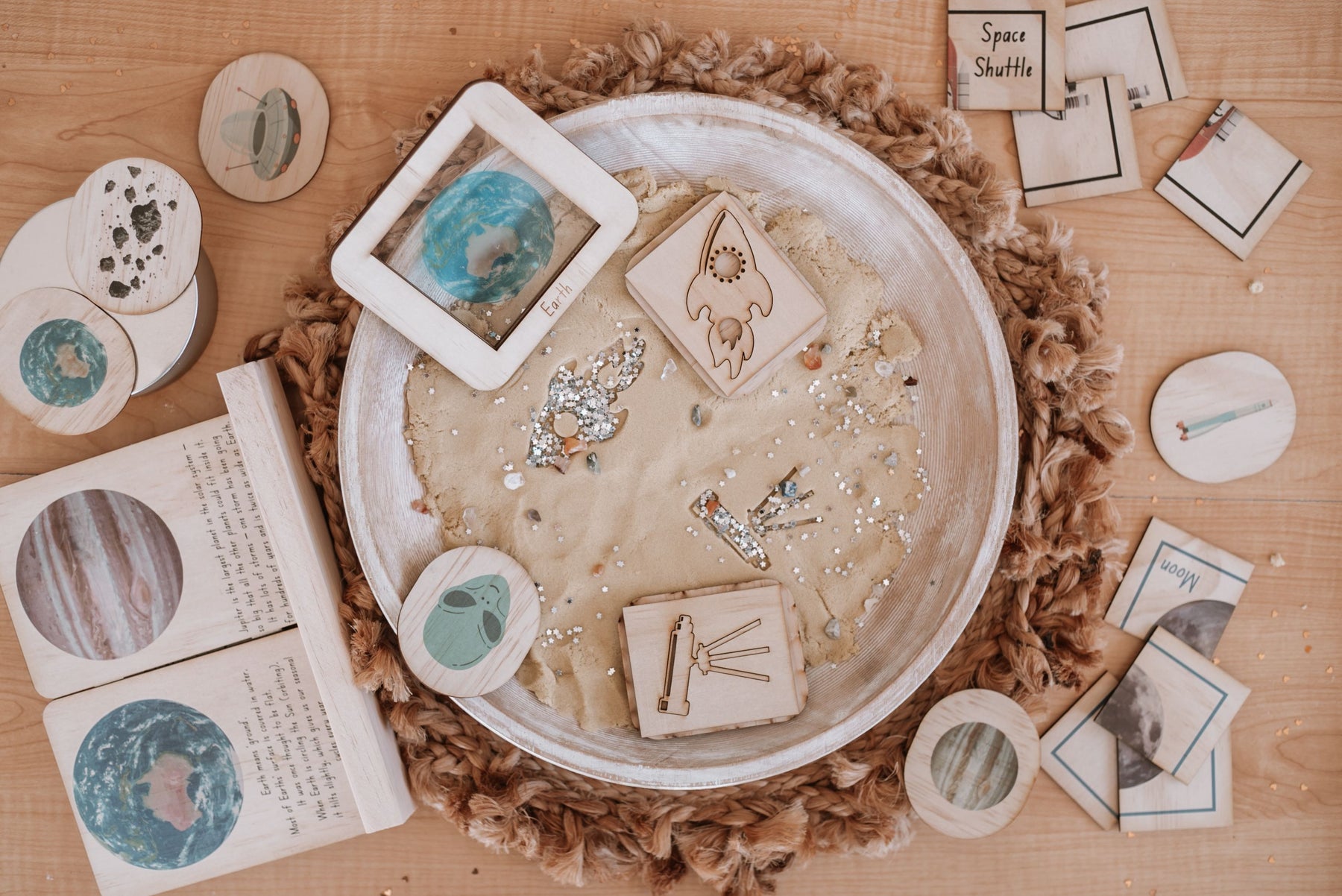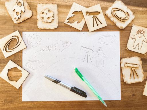 Mega Space pack contains two space stamps together with two cutouts. The top side of the stamp is engraved with a space theme picture outline while the underside features the single layered laser engraved cutout which is thick enough to create a great impression in playdough, sand or similar material.  The cut-out outline can be used as a craft stencil developing fine motor skills to manipulate a pencil inside the space to draw the object. Fantastic to engage independent play and exploration. What sensory base leaves the clearest impression? If you apply differ pressure how does the impression alter?